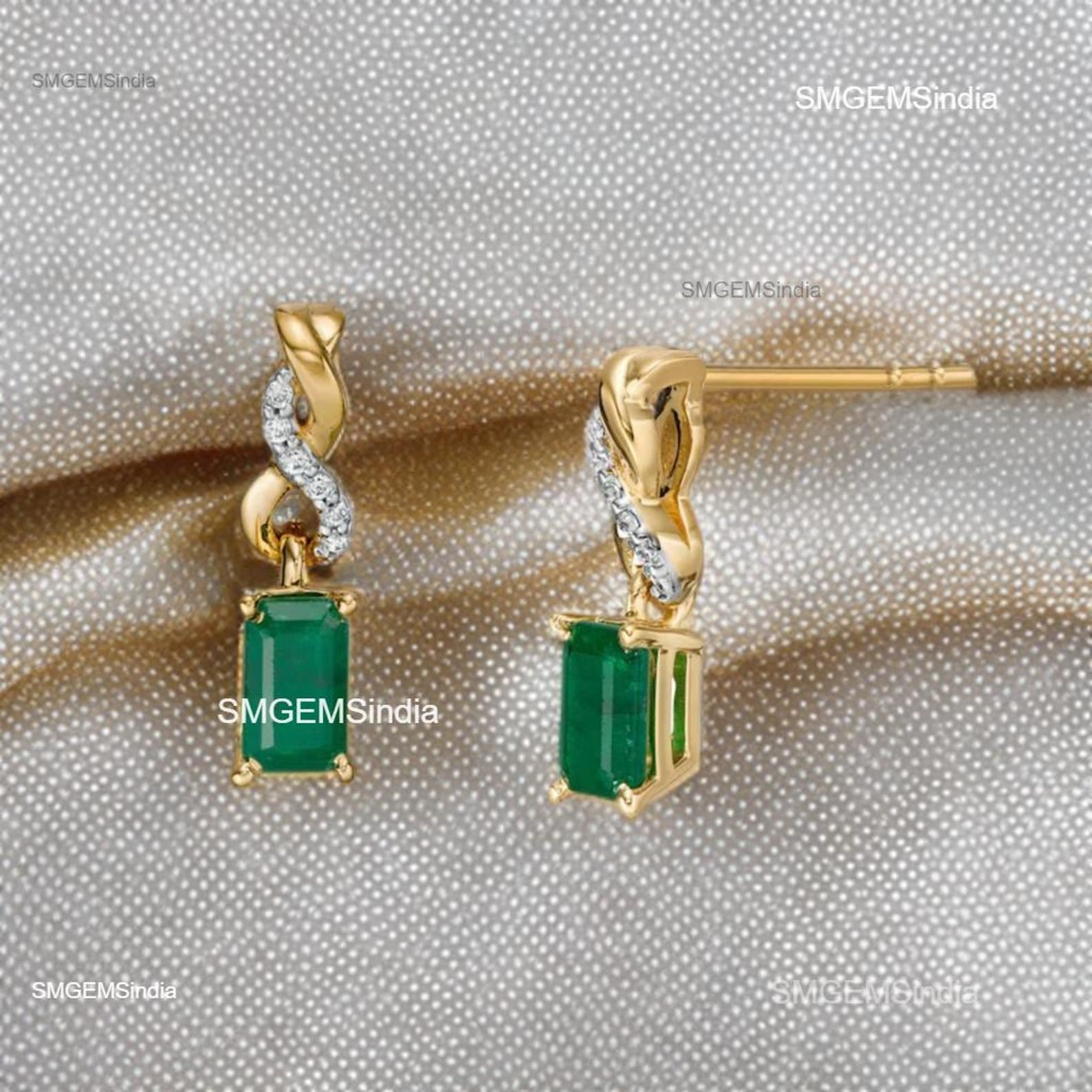 Emerald cut Natural Emerald and Diamond Twist Drop Earrings in 14K Gold Wedding Gift for her