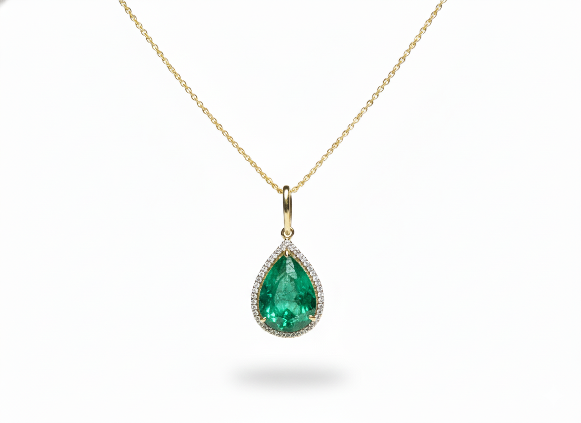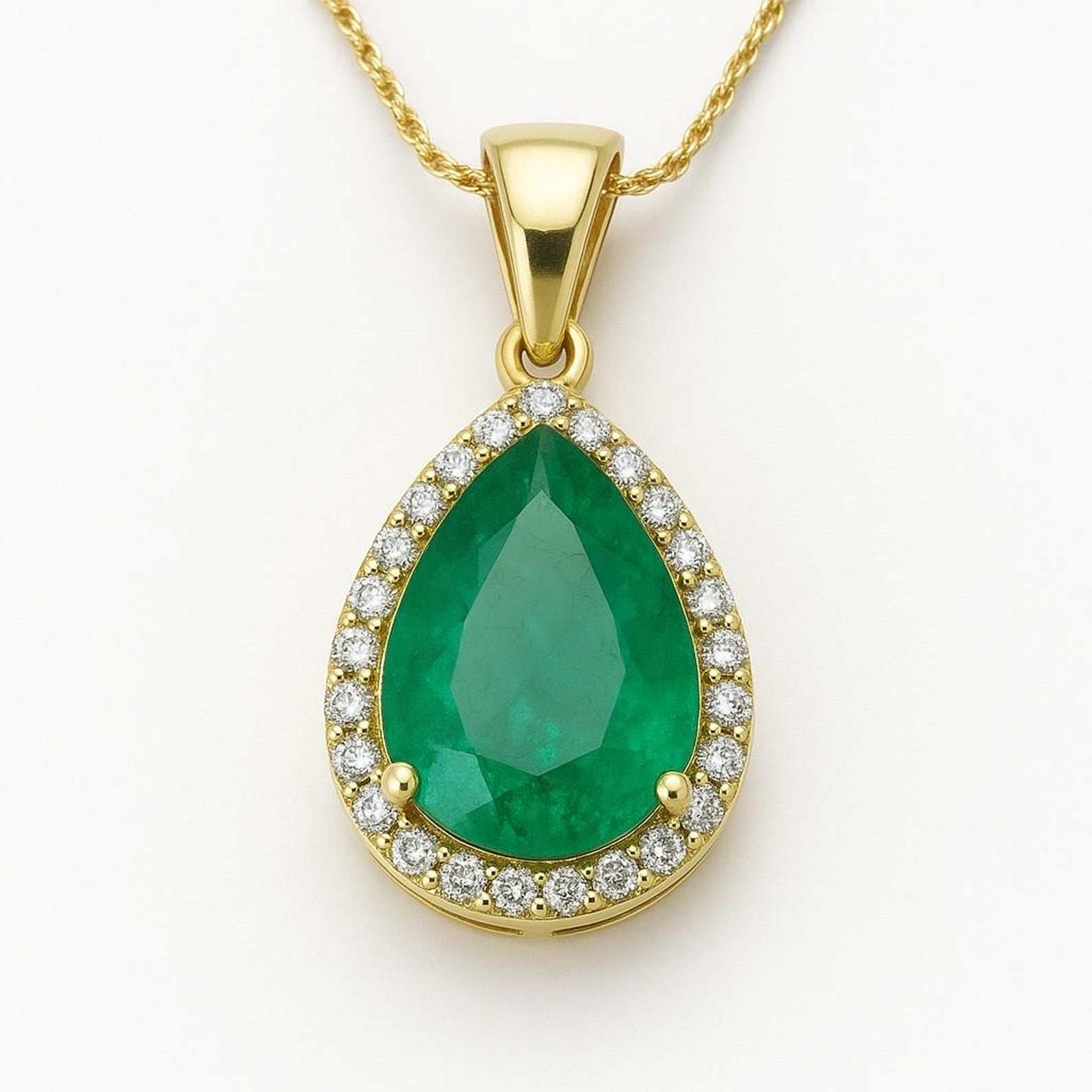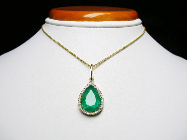 5.90 carat Teardrop natural Emerald Pendant with Diamond Halo Fine Gold Jewelry