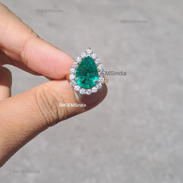 3.50 carat Pear Shape Natural Zambian Emerald And Diamond Engagement Ring in 14k Solid Gold Fine Jewelry