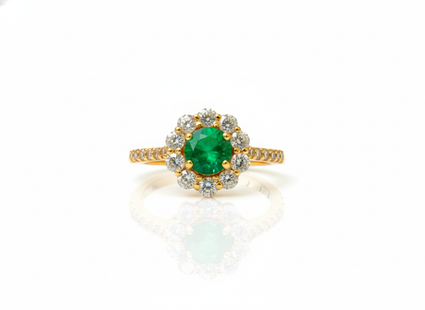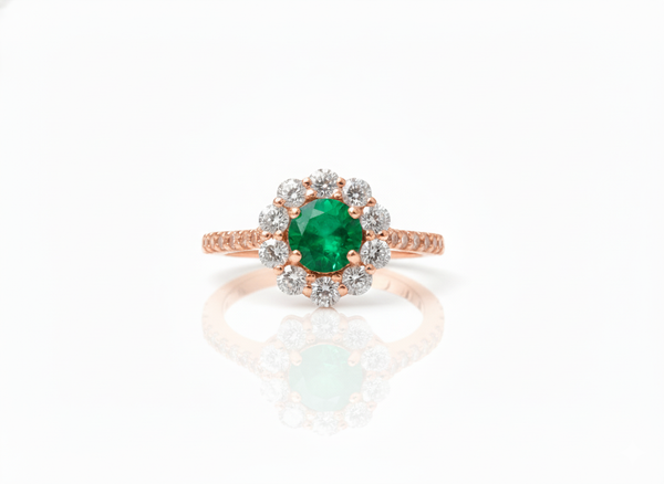 Round Natural Emerald & Diamond Halo Engagement Ring in 14K Gold Handmade Fine Gold Jewelry