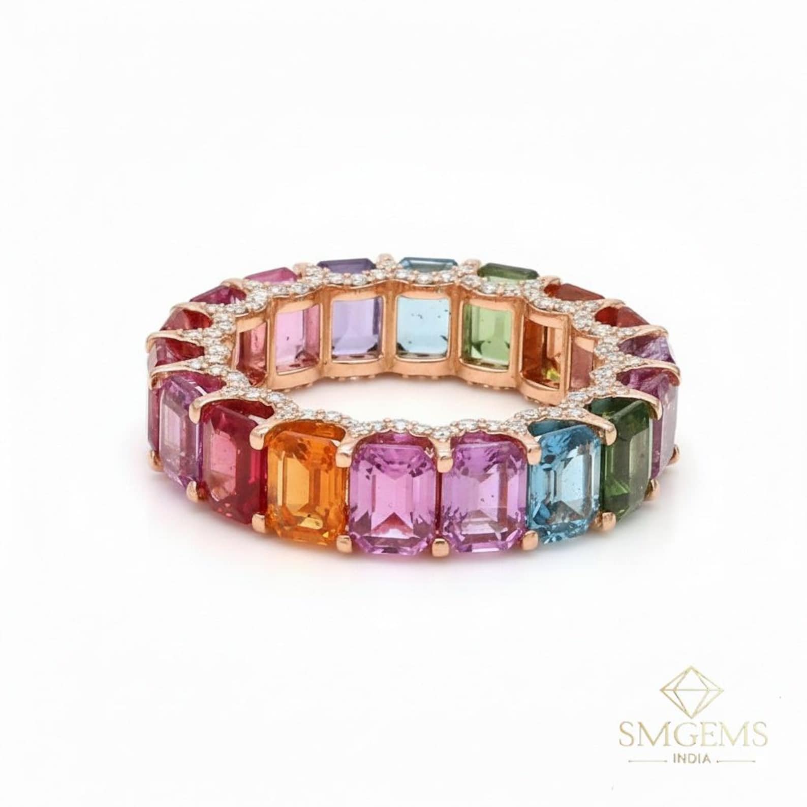 Rainbow Sapphire Diamond Eternity Band Ring Emerald cut 14k Gold Prong Setting