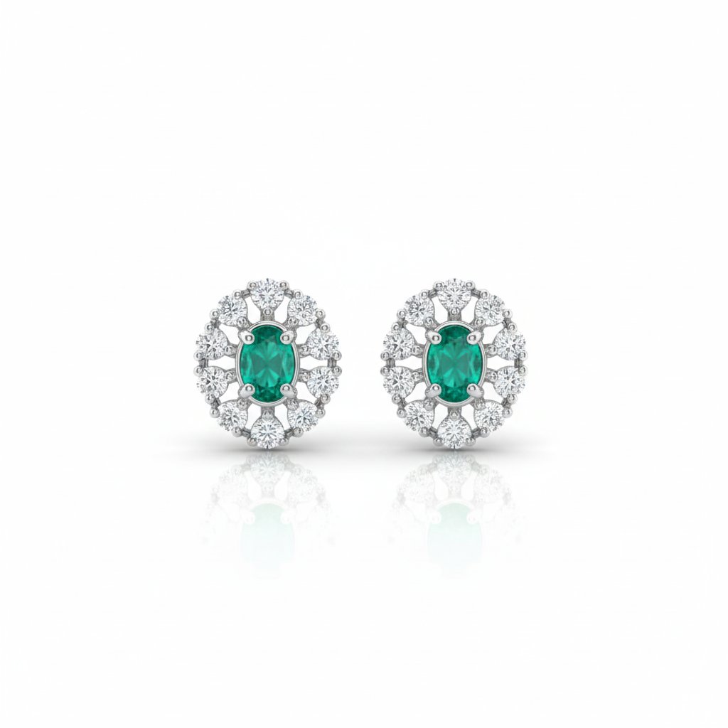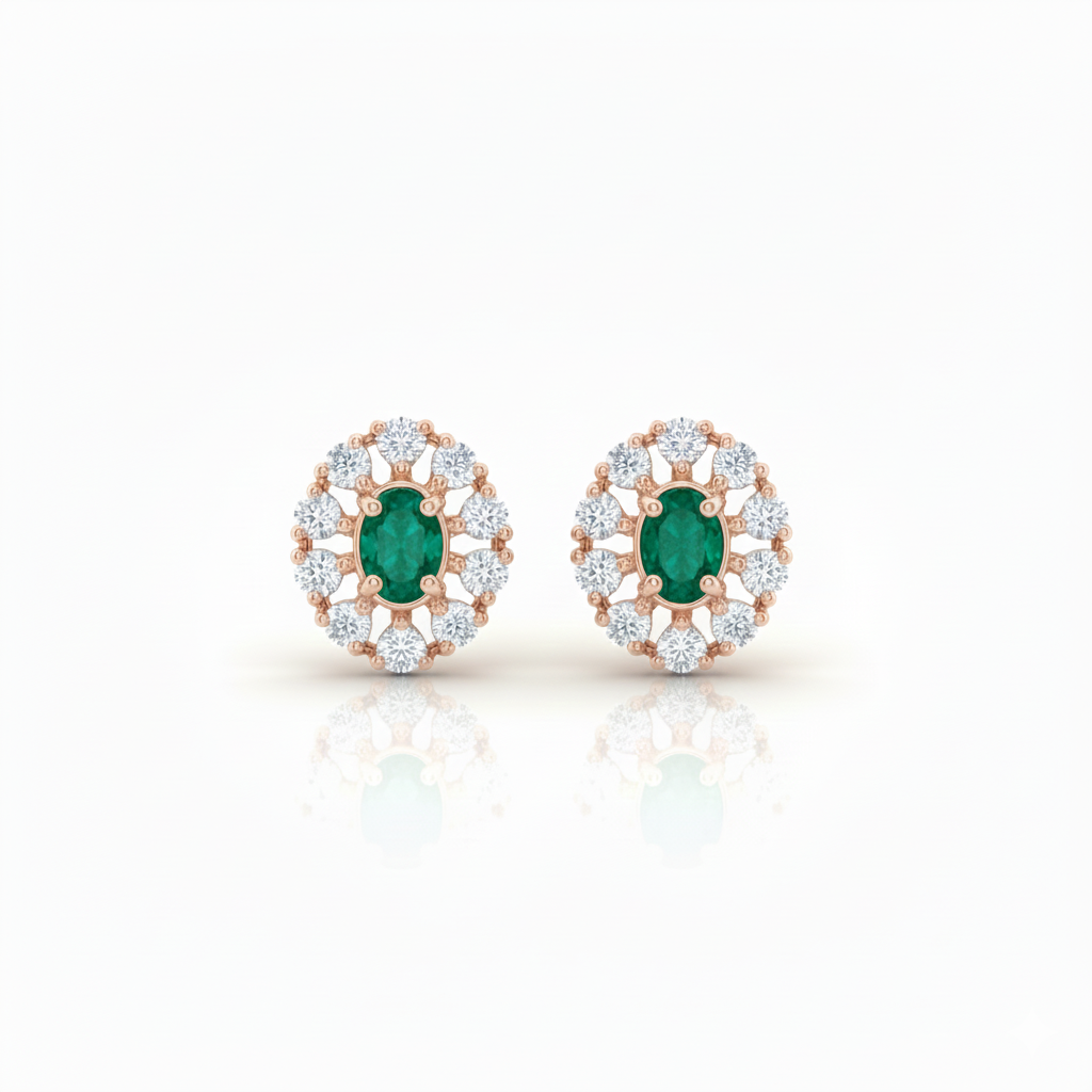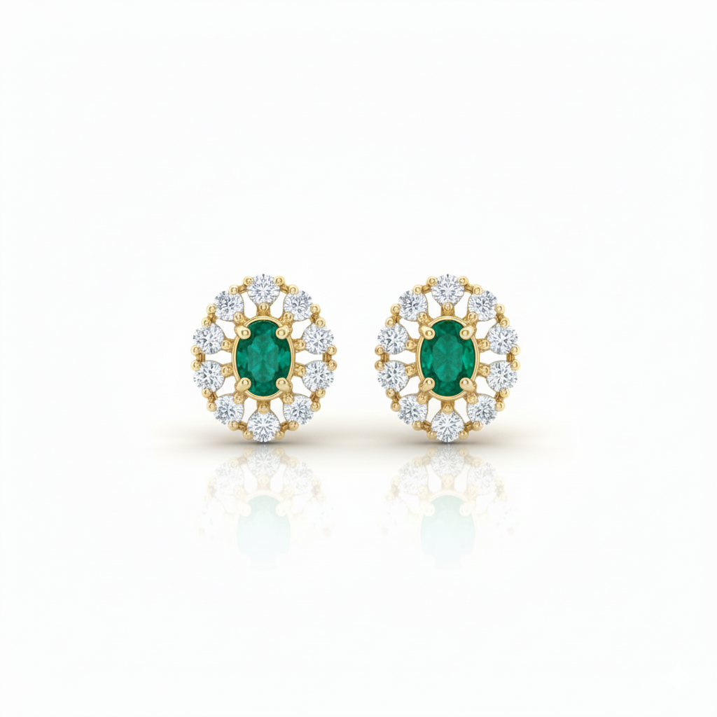 Oval Natural Emerald Stud Earrings 14k Gold Diamond Halo Earrings