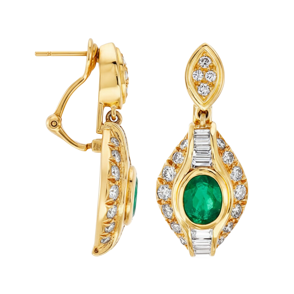 7,80 ct dunkelgrüne Statement-Ohrhänger mit großen sambischen Smaragden im Smaragd- und Ovalschliff, 18 Karat Gold, Smaragdohrringe, ovale Smaragdstecker