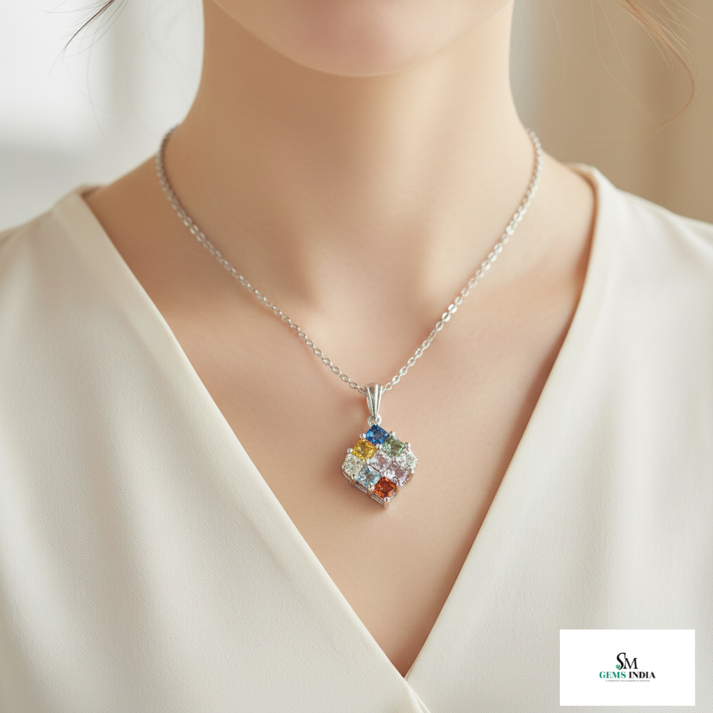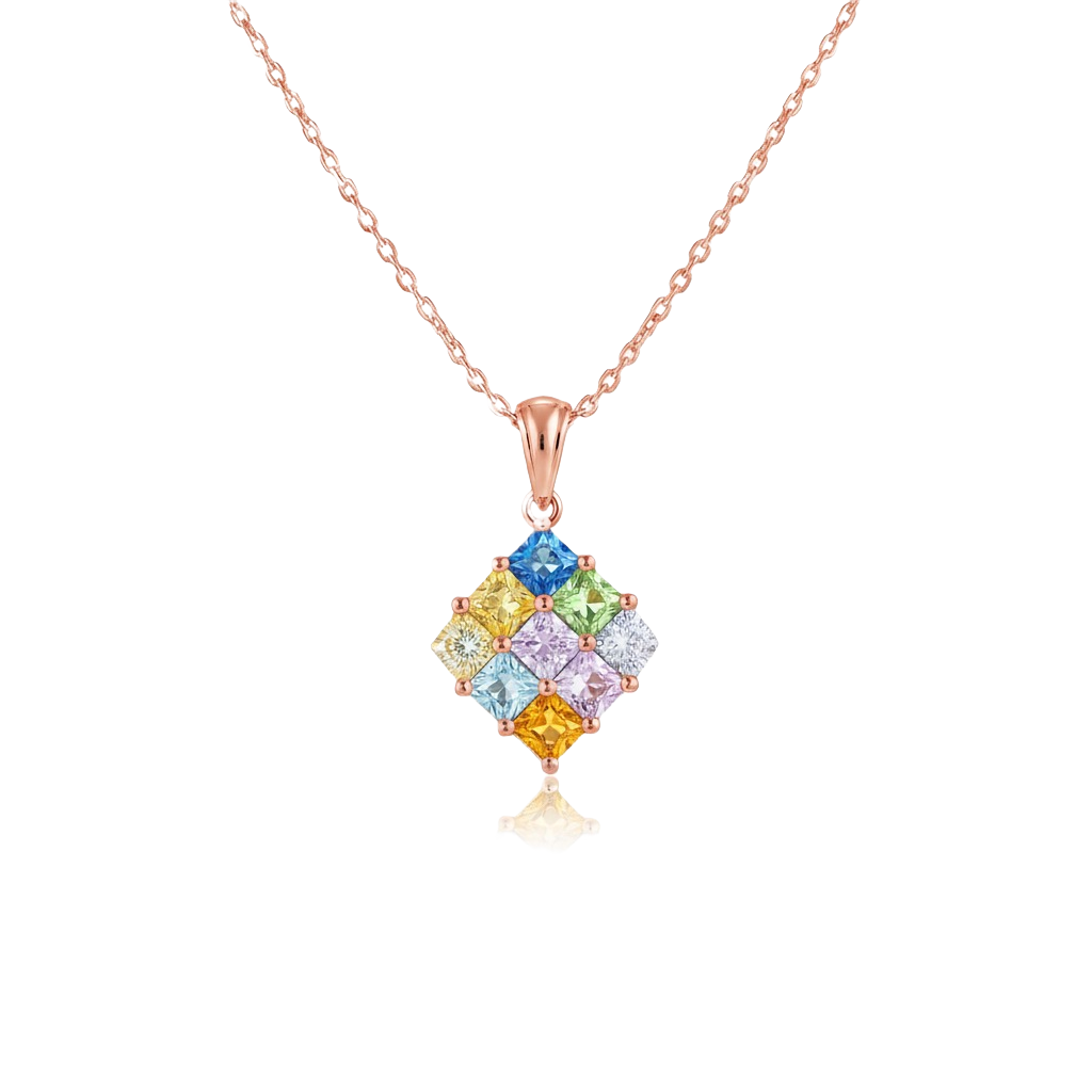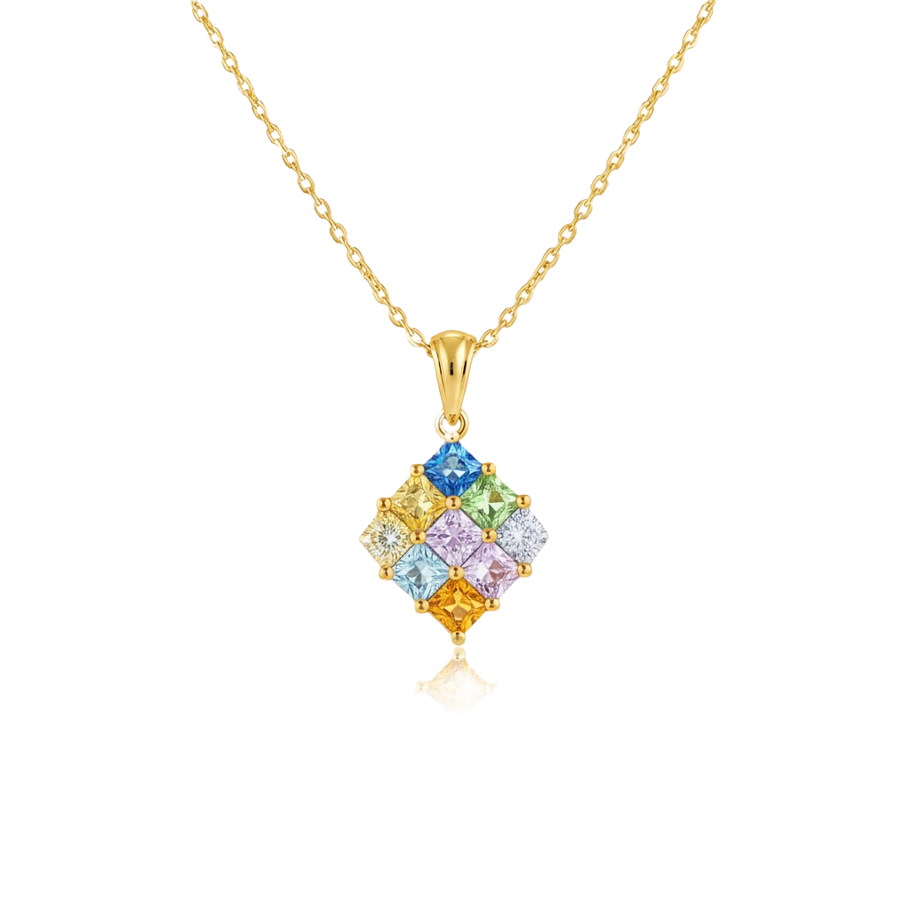 Multi Sapphire Gold Princess-Cut Multicolor Gemstone Square Pendant