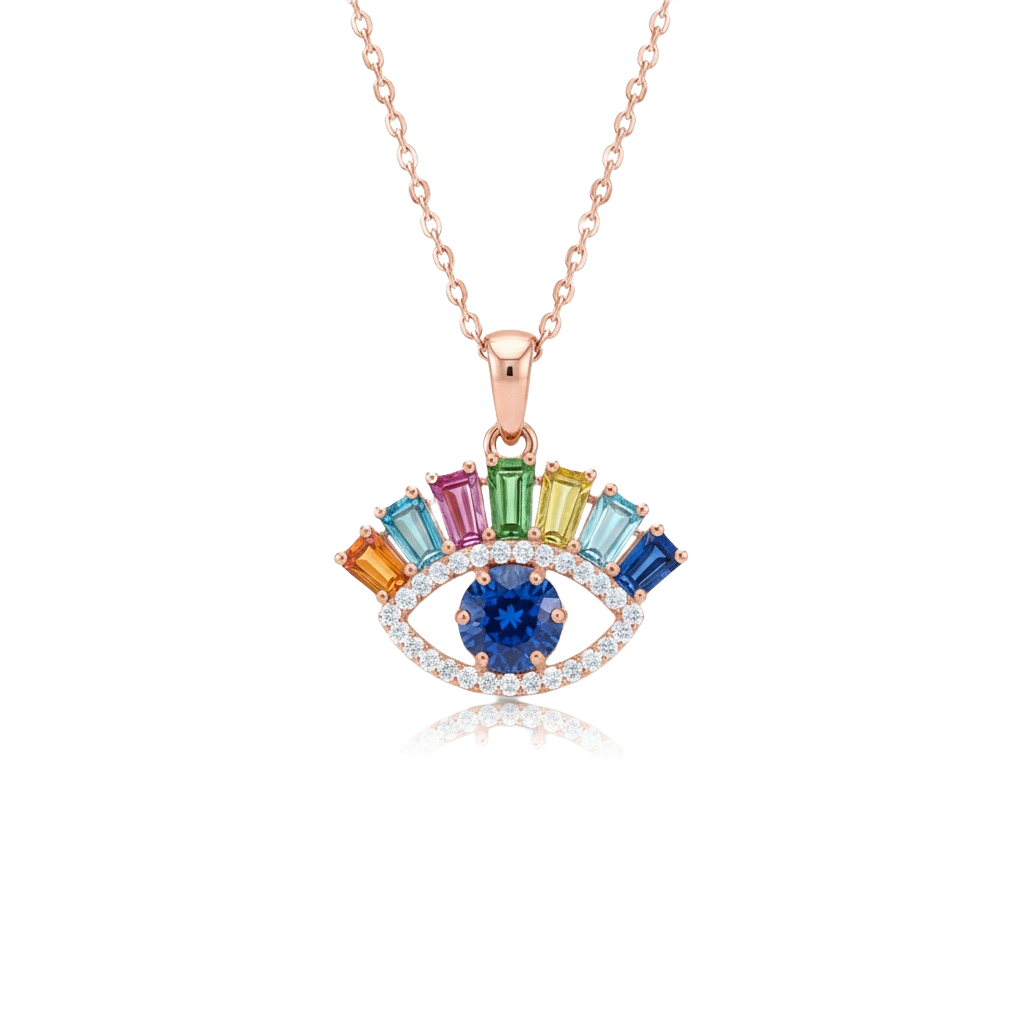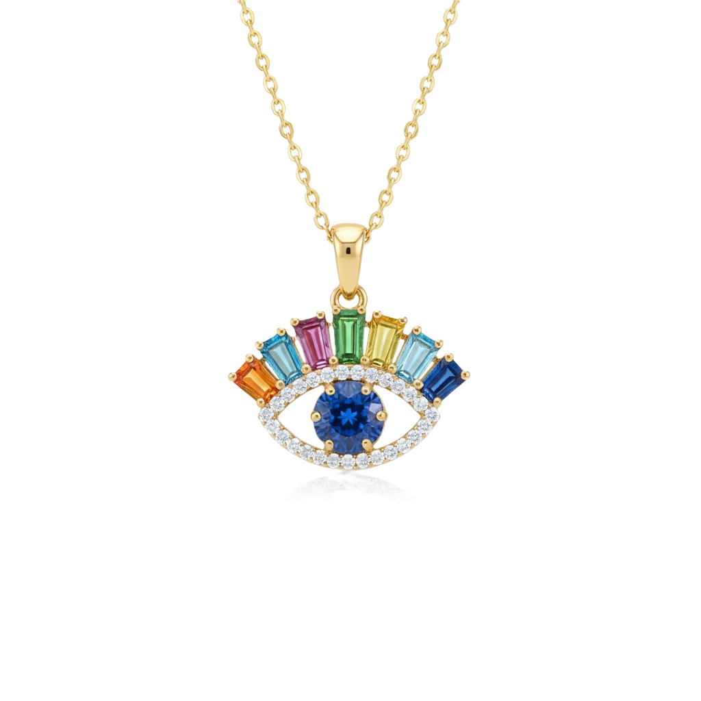 Rainbow Evil Eye Pendant Multicolor Baguette Gemstones in Gold
