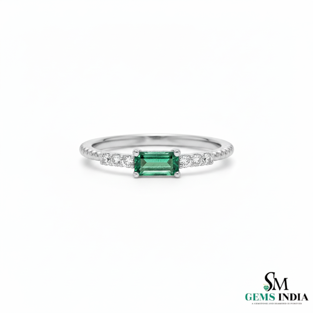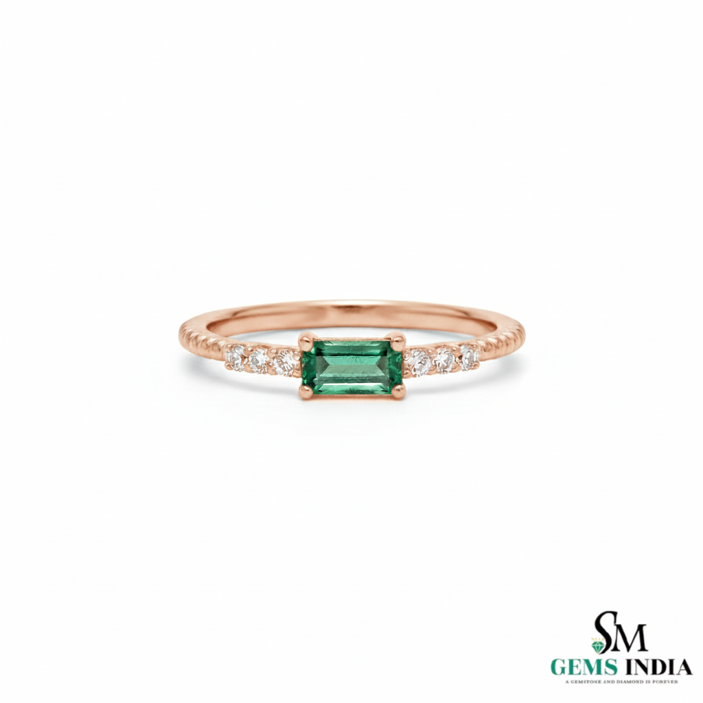 Mini Style Natural Emerald Baguette And Diamond Gift Ring - 14K Solid Gold Women Real Emerald Ring