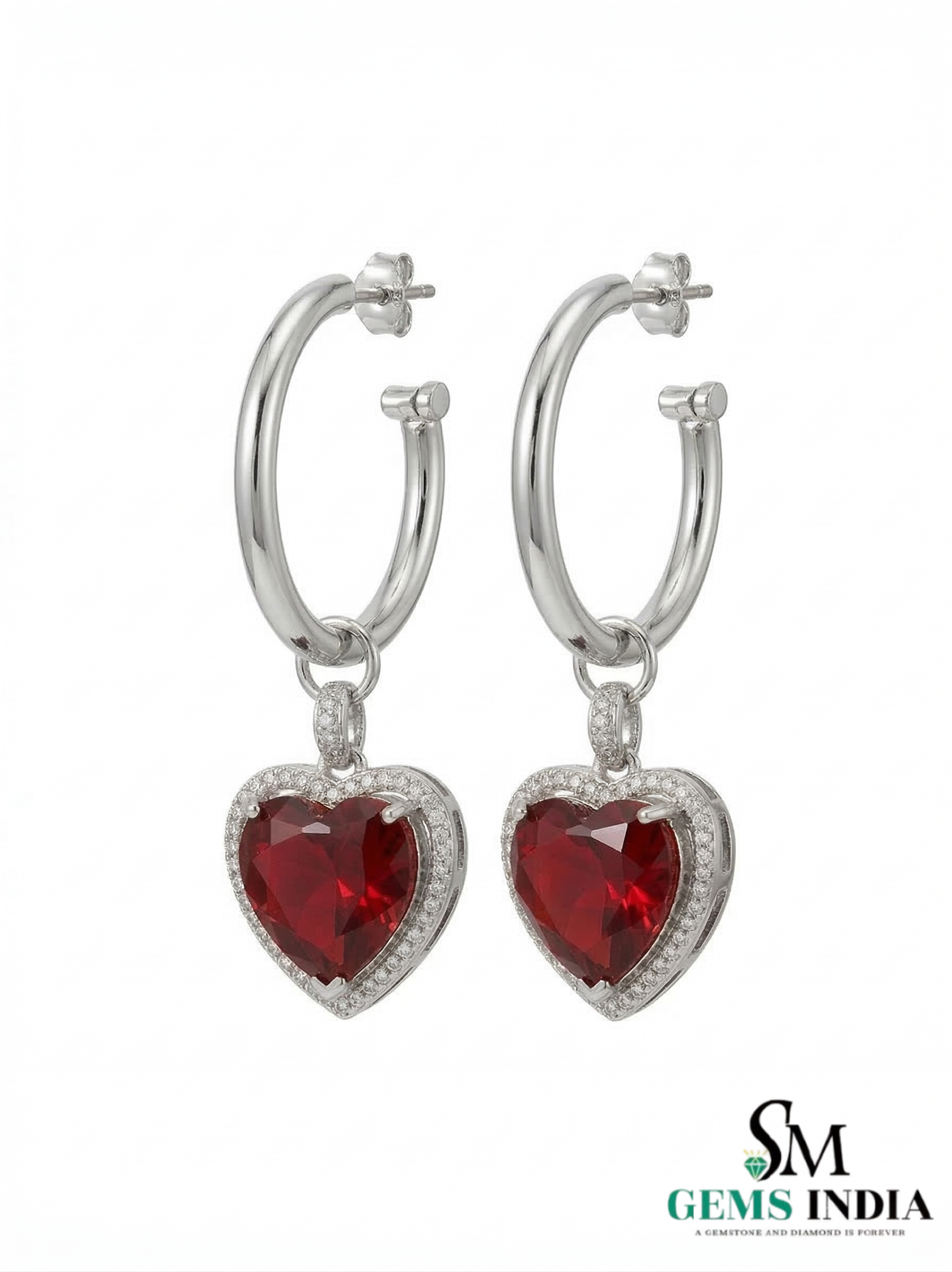 Heart Shaped Ruby Dangle Hoop Earrings with Diamond Halo - Romantic Jewelry For Her