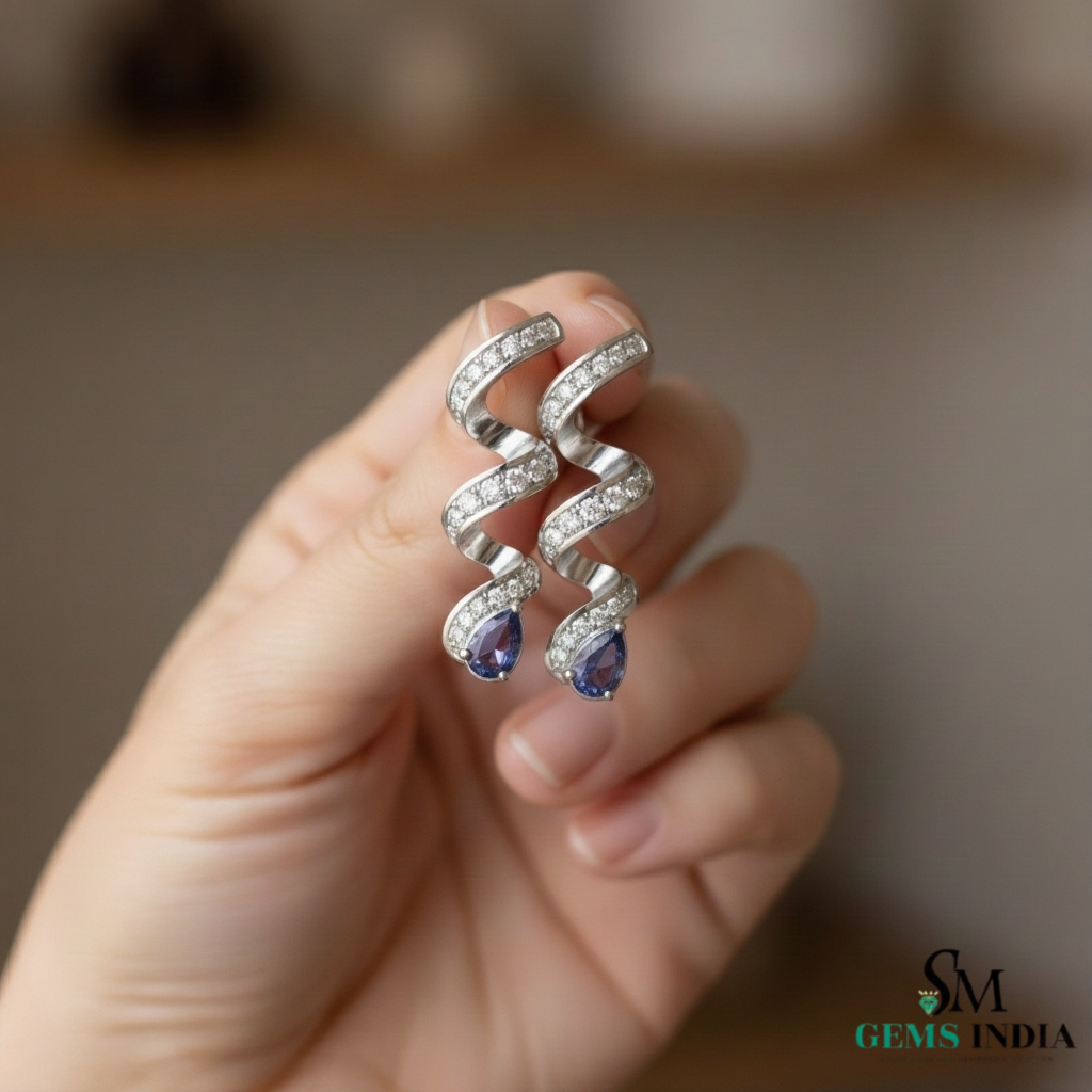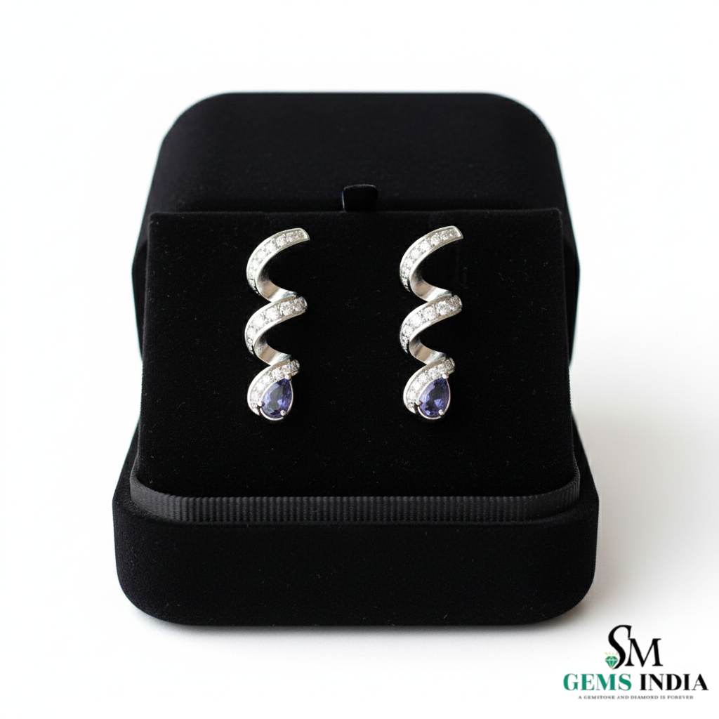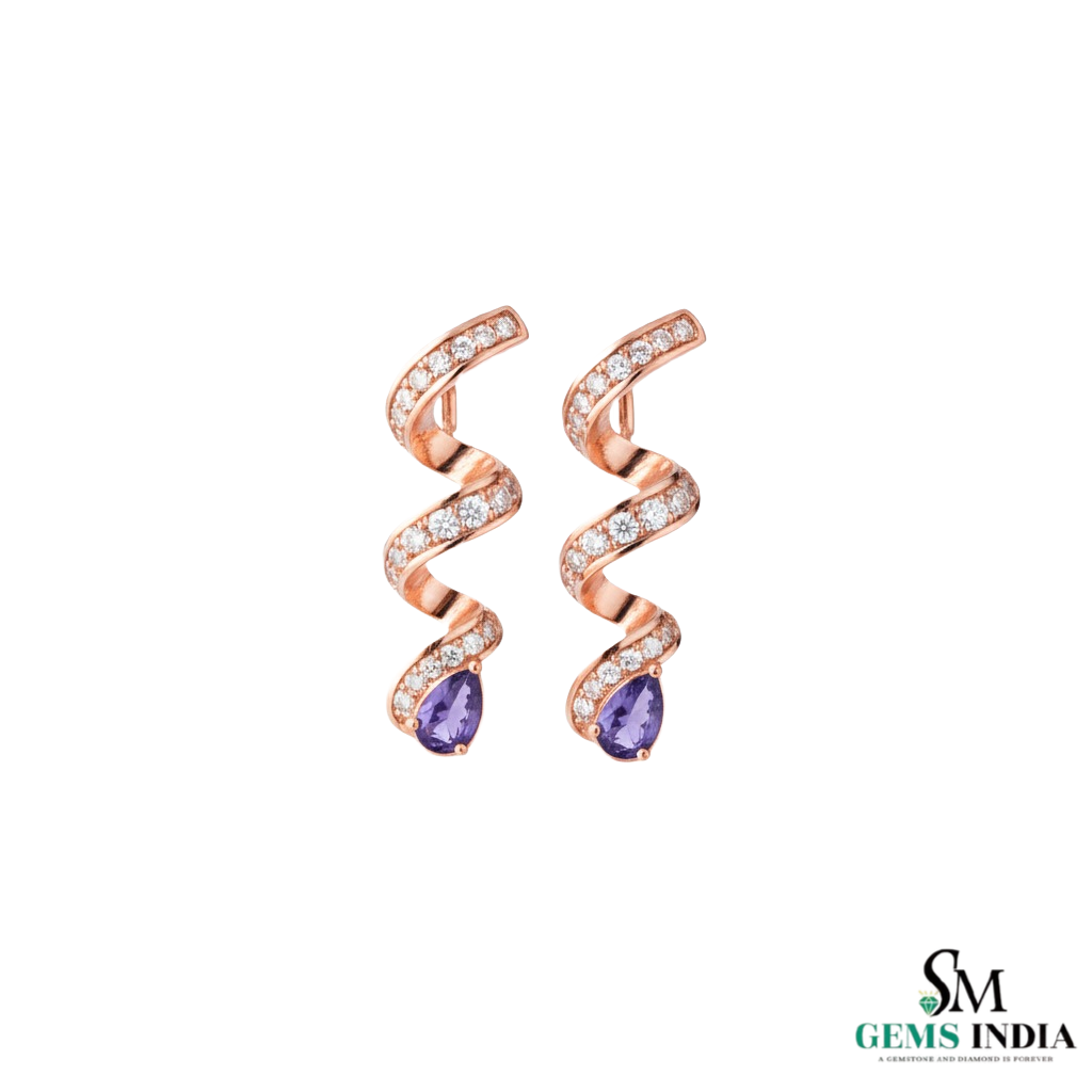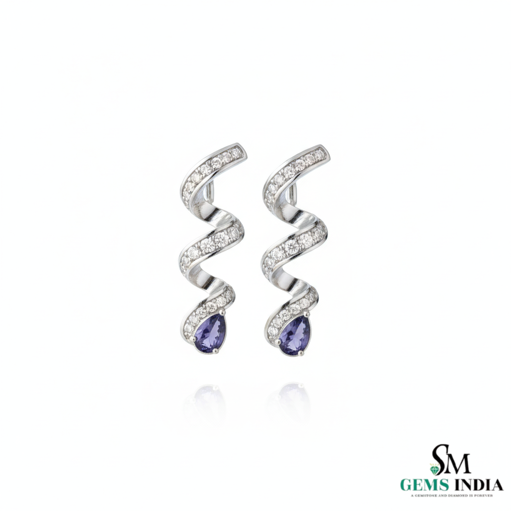 Pear Cut Blue Tanzanite & Diamond Spiral Drop Earrings in 14k and 18kk Gold