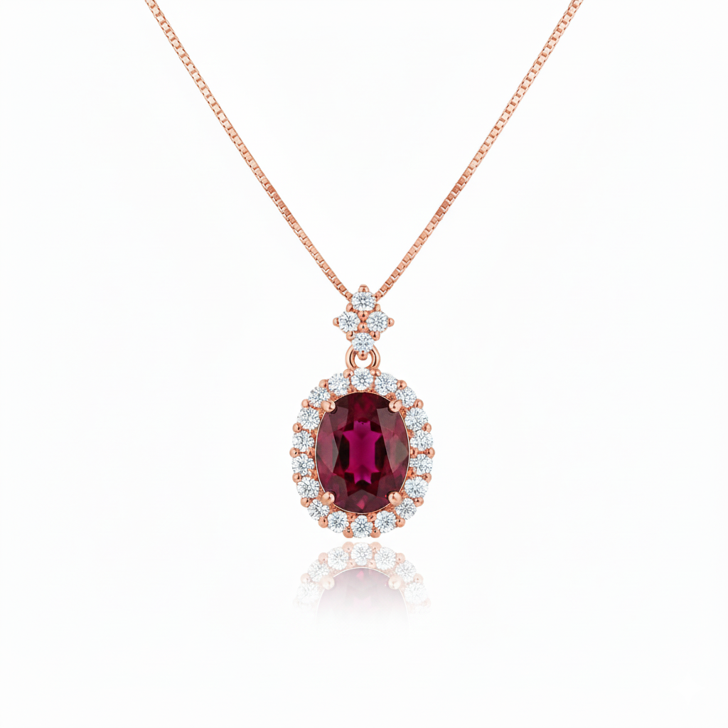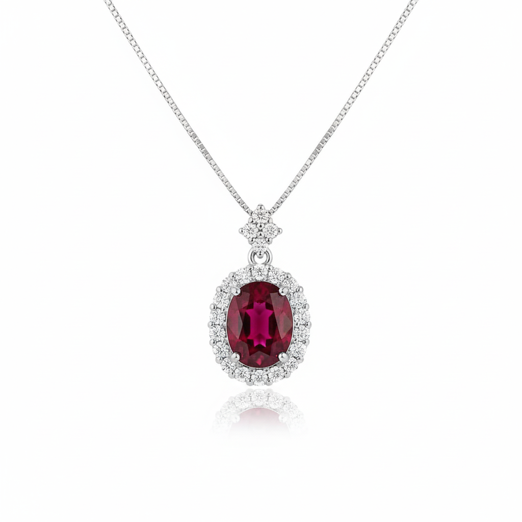 Oval Cut Ruby & Diamond Halo Pendant in 14K Gold