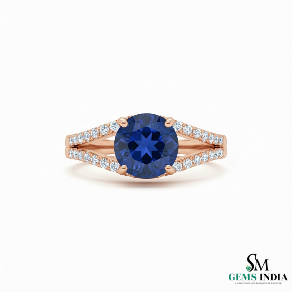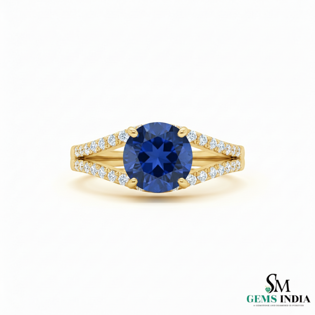 Round Blue Sapphire Diamond Split Shank Ring in 18k Gold