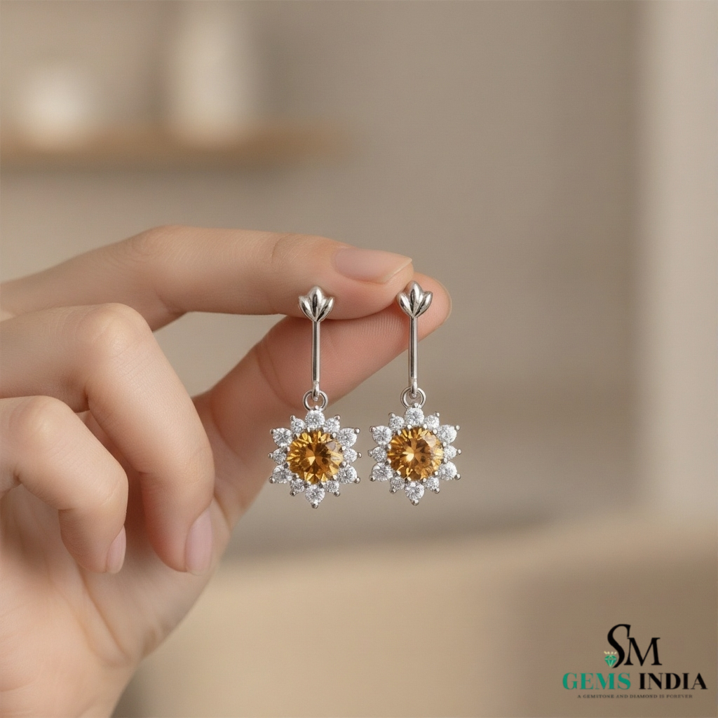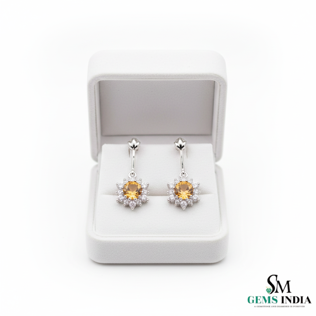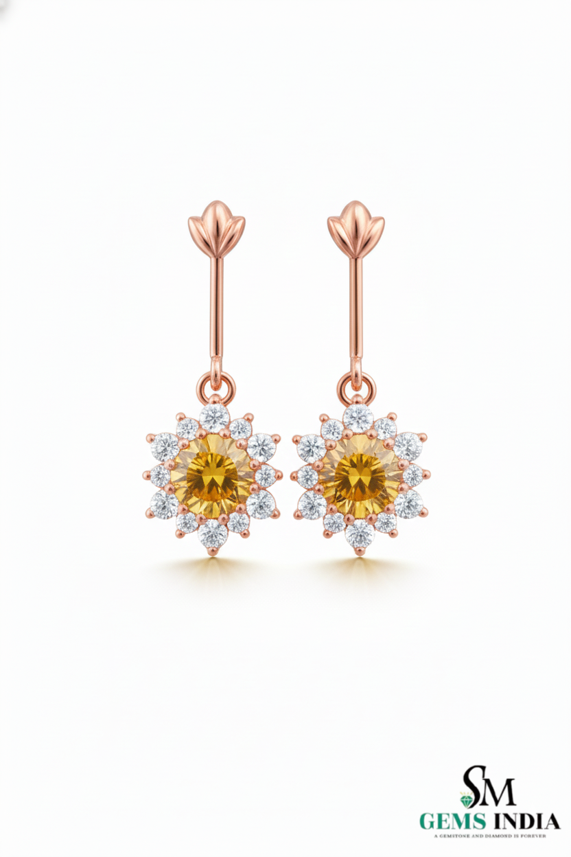 Round cut Natural Citrine & Diamond Floral Drop Earrings - Luxury Jewelry Gift