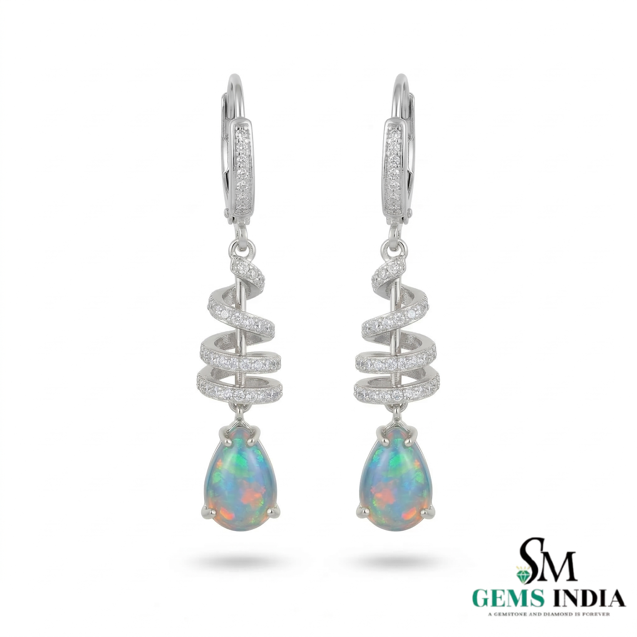 Pear Opal Drop Earrings with Diamond Spiral Design
