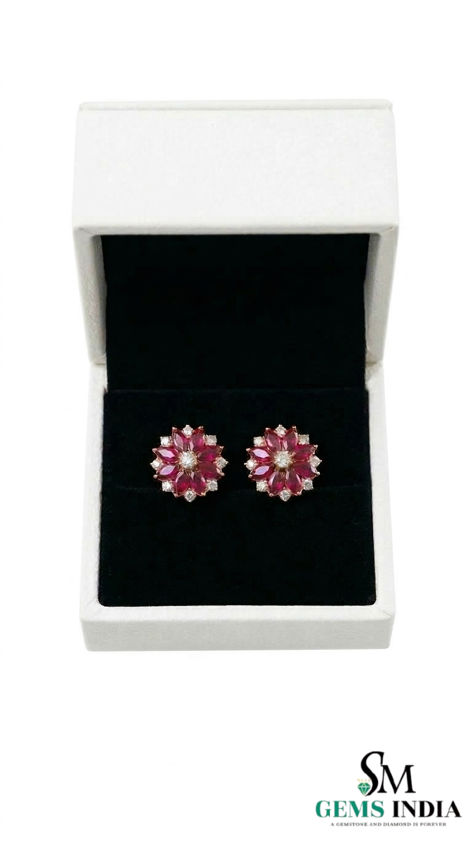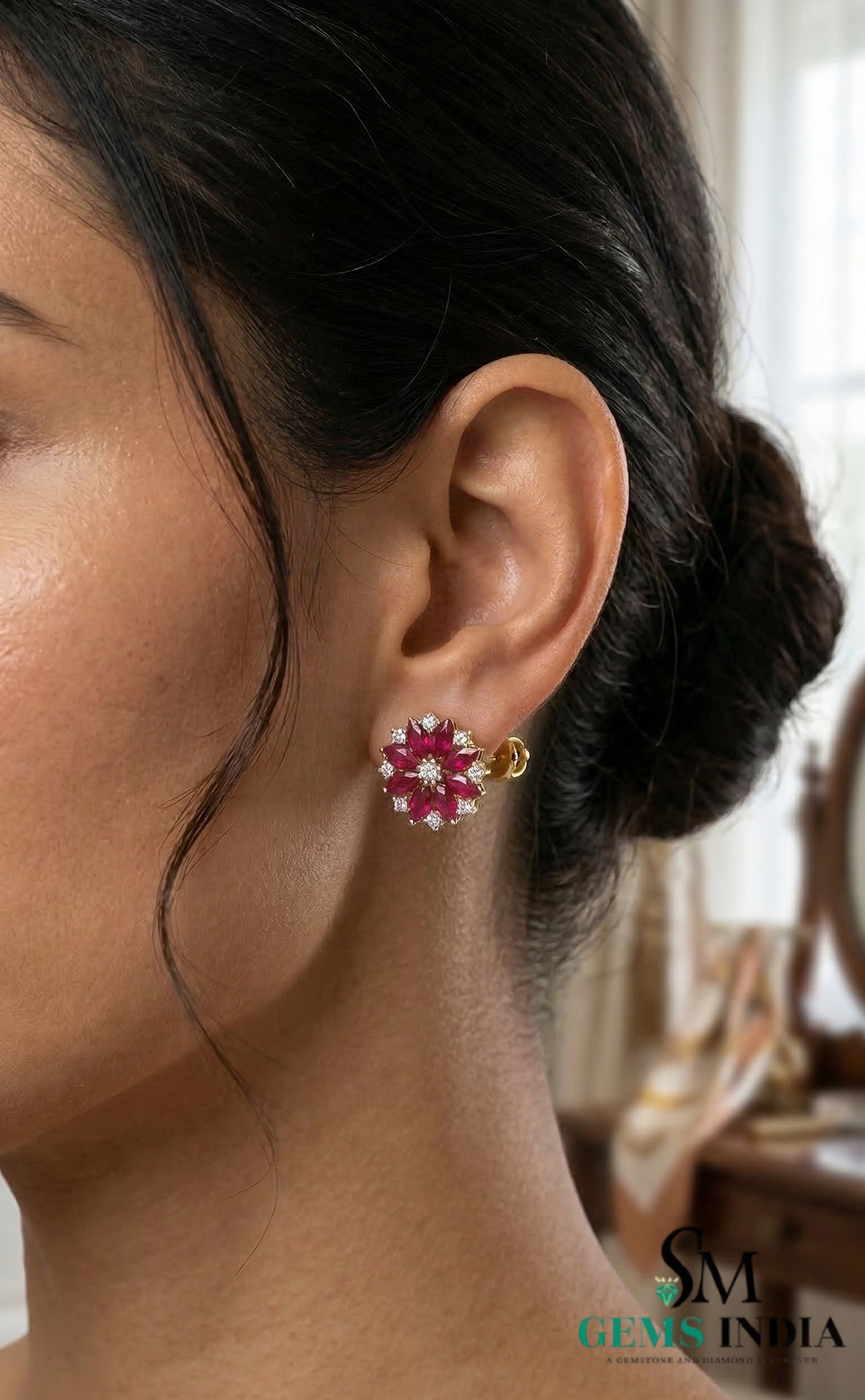 Marquise Ruby Flower Stud Earrings with Diamonds - July Birthstone Jewelry