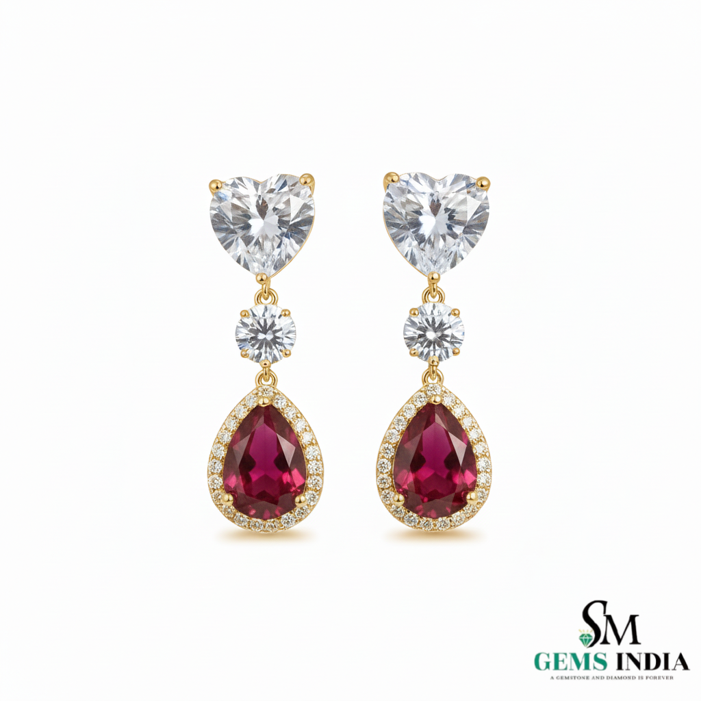 Pear Ruby Drop Earrings with Heart Moissanite & Diamond Accents in 18k Gold