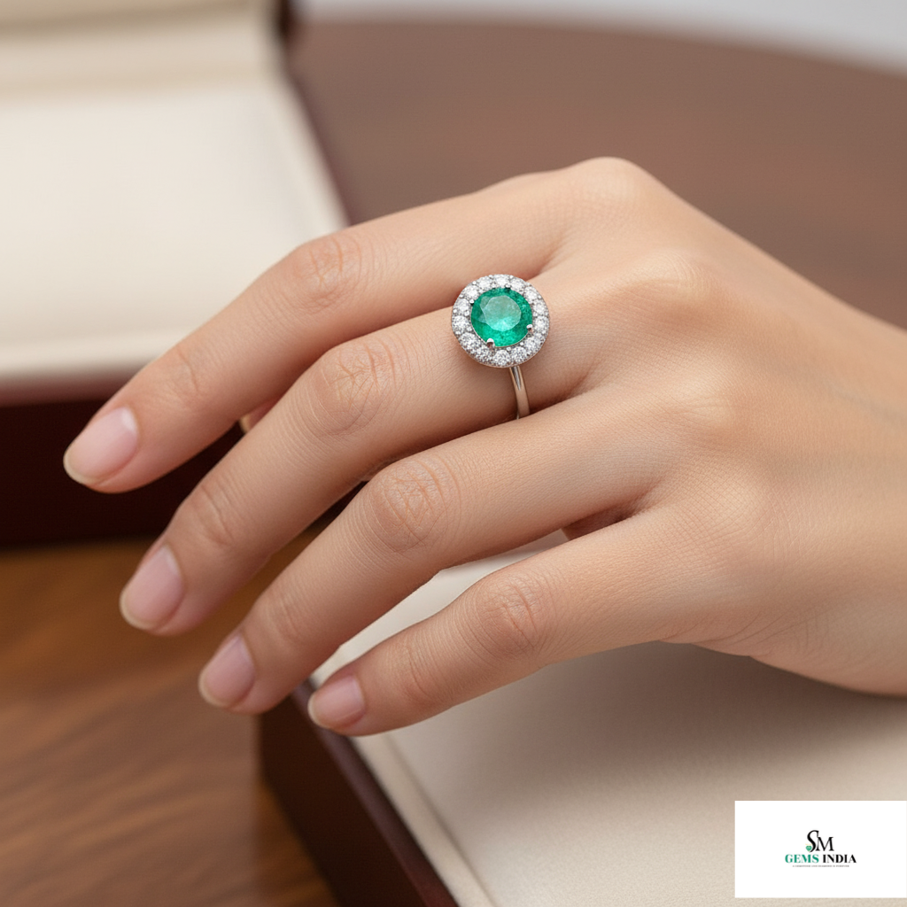1.50 carat round natural Zambian emerald Gemstone and diamonds ring for woman's in 14k Solid Gold