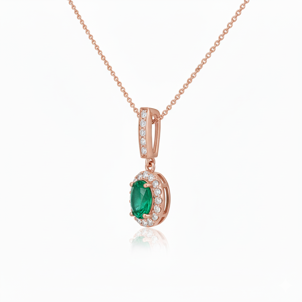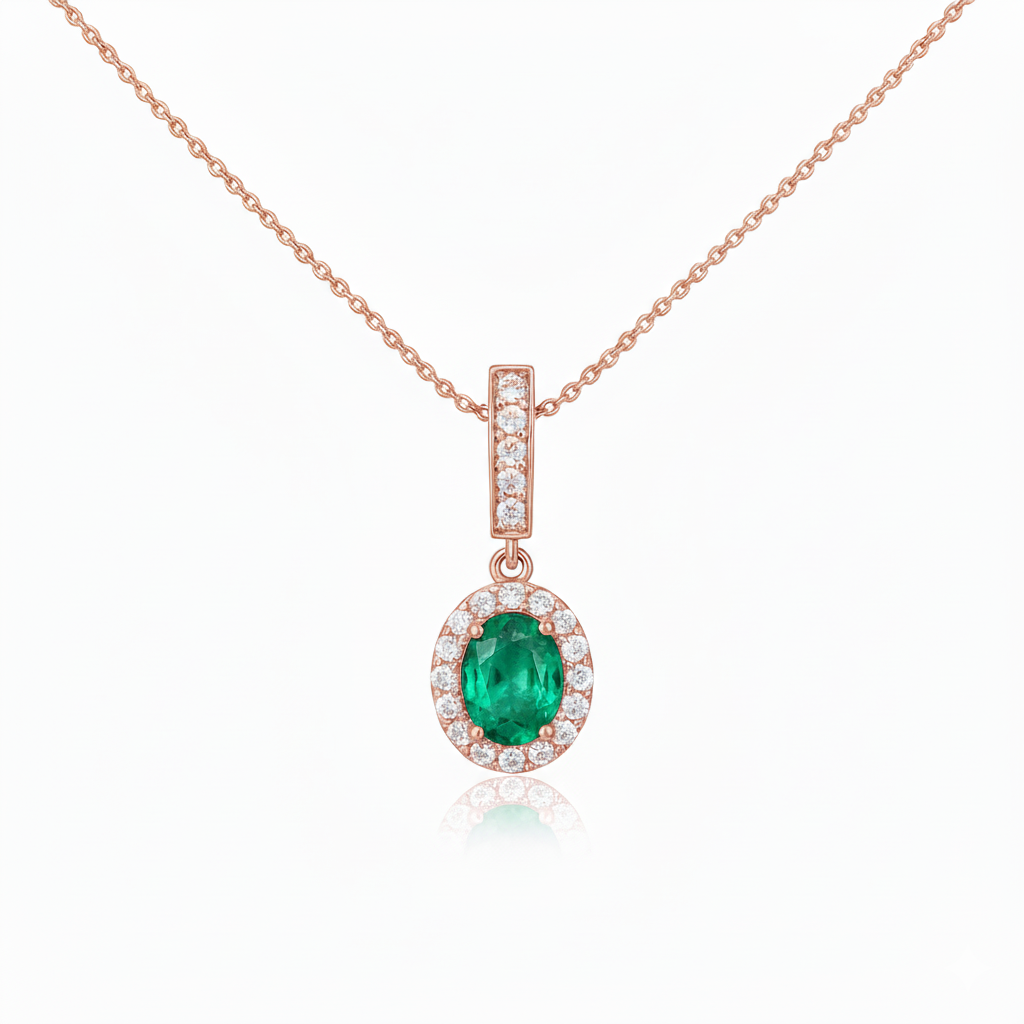 2 carat Oval cut 14K Gold Natural Emerald Halo Pendant with Dainty Diamond Accents