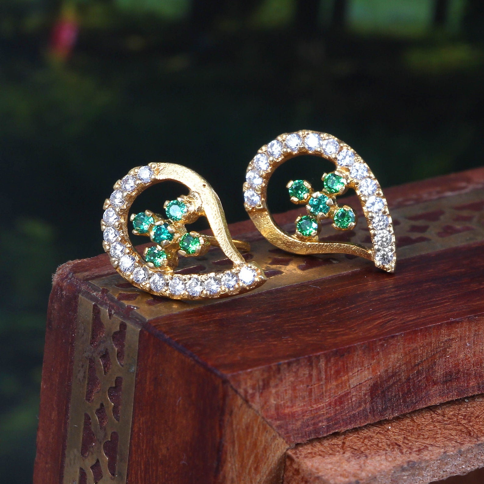 Teardrop Stud Earrings with Round Natural Emerald Cluster & Diamonds in Gold Unique Gift for her