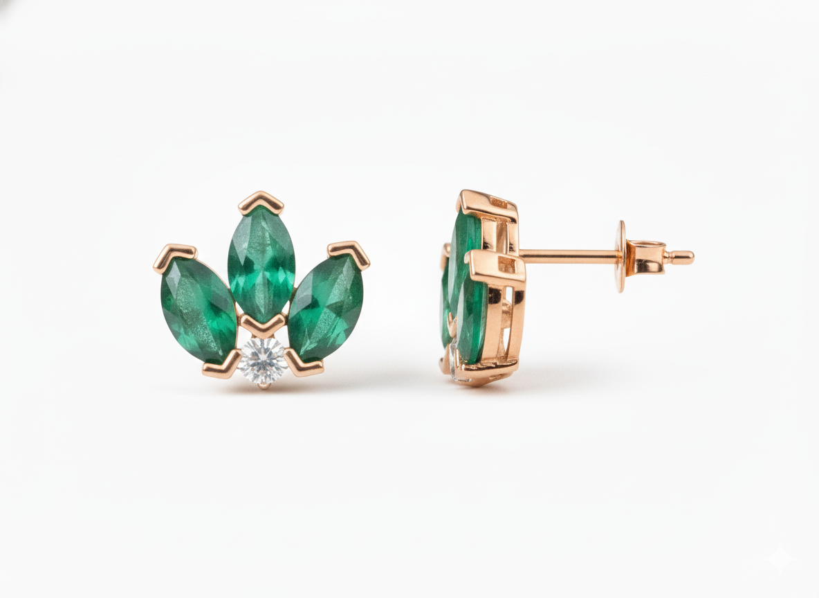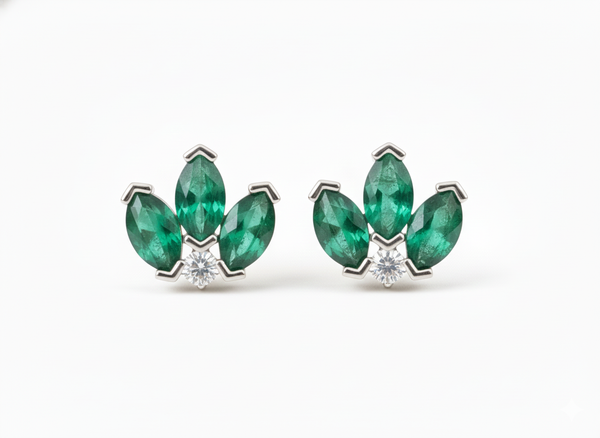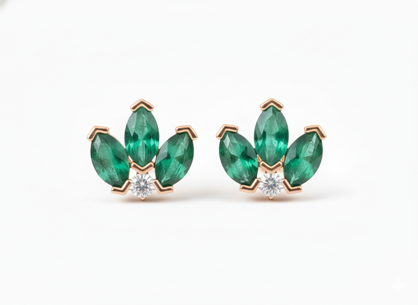 Marquise shape Natural Emerald Diamond Floral Stud Earrings – 14K Gold