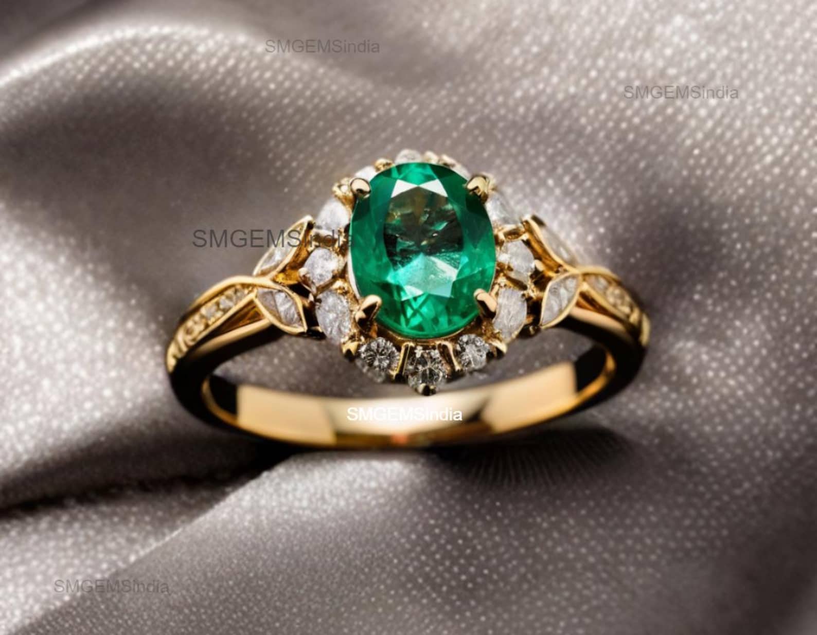 2.50 carat Oval Cut Emerald and Diamond Halo Ring in 14K Gold Vintage Engagement Ring