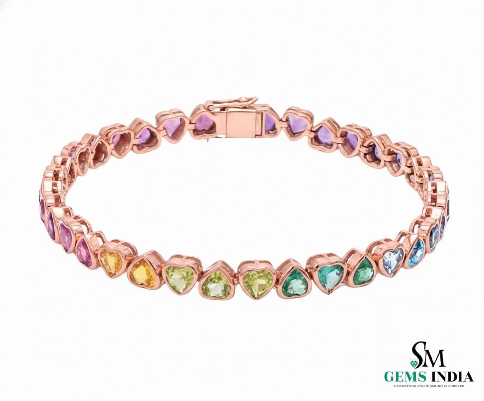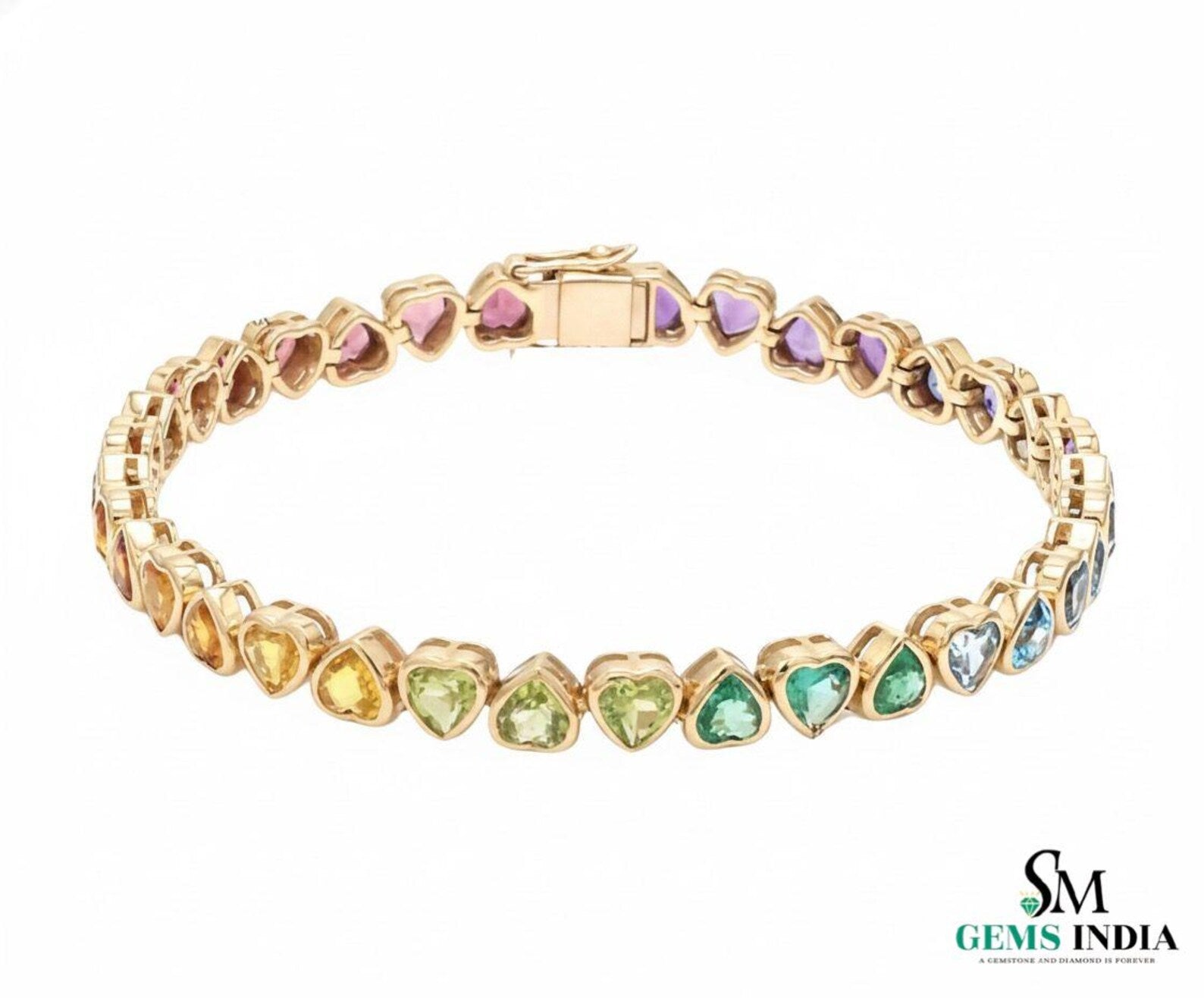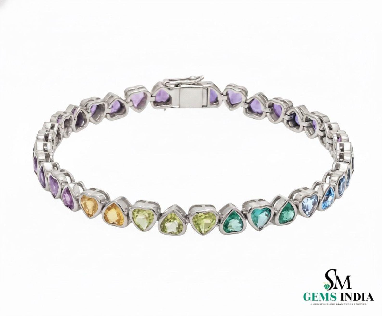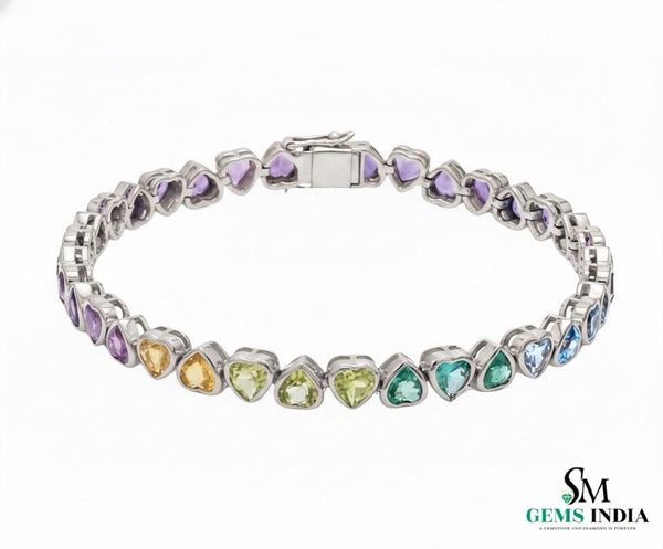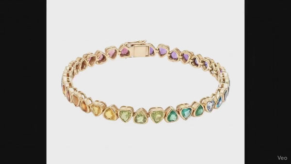 Natural Rainbow sapphire heart Shape tennis bracelet in 18K gold bezel set rainbow