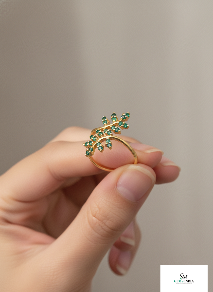 080 carats Gold Leaf Ring with Natural Green Emeralds 14k Gold Fine Jewelry