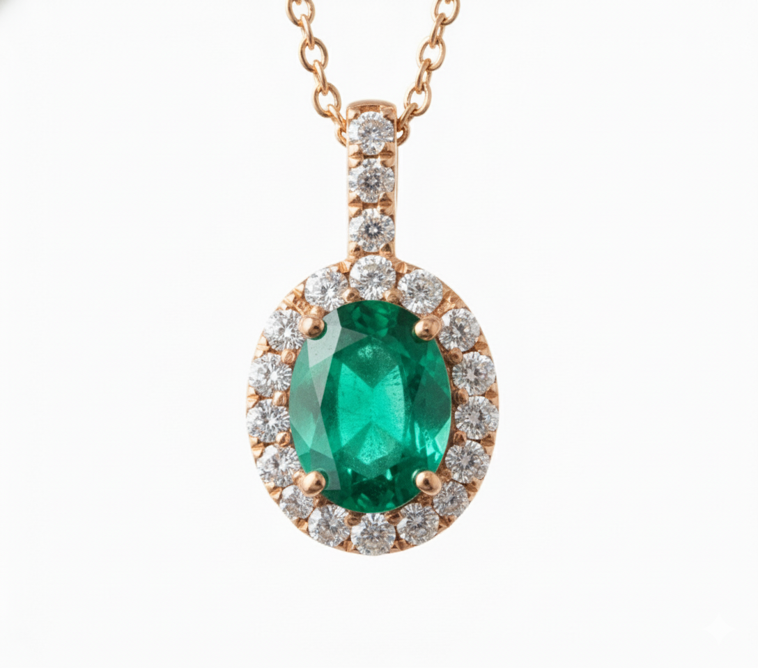 Natural Emerald Halo Pendant Necklace Oval Green Gemstone with Diamonds