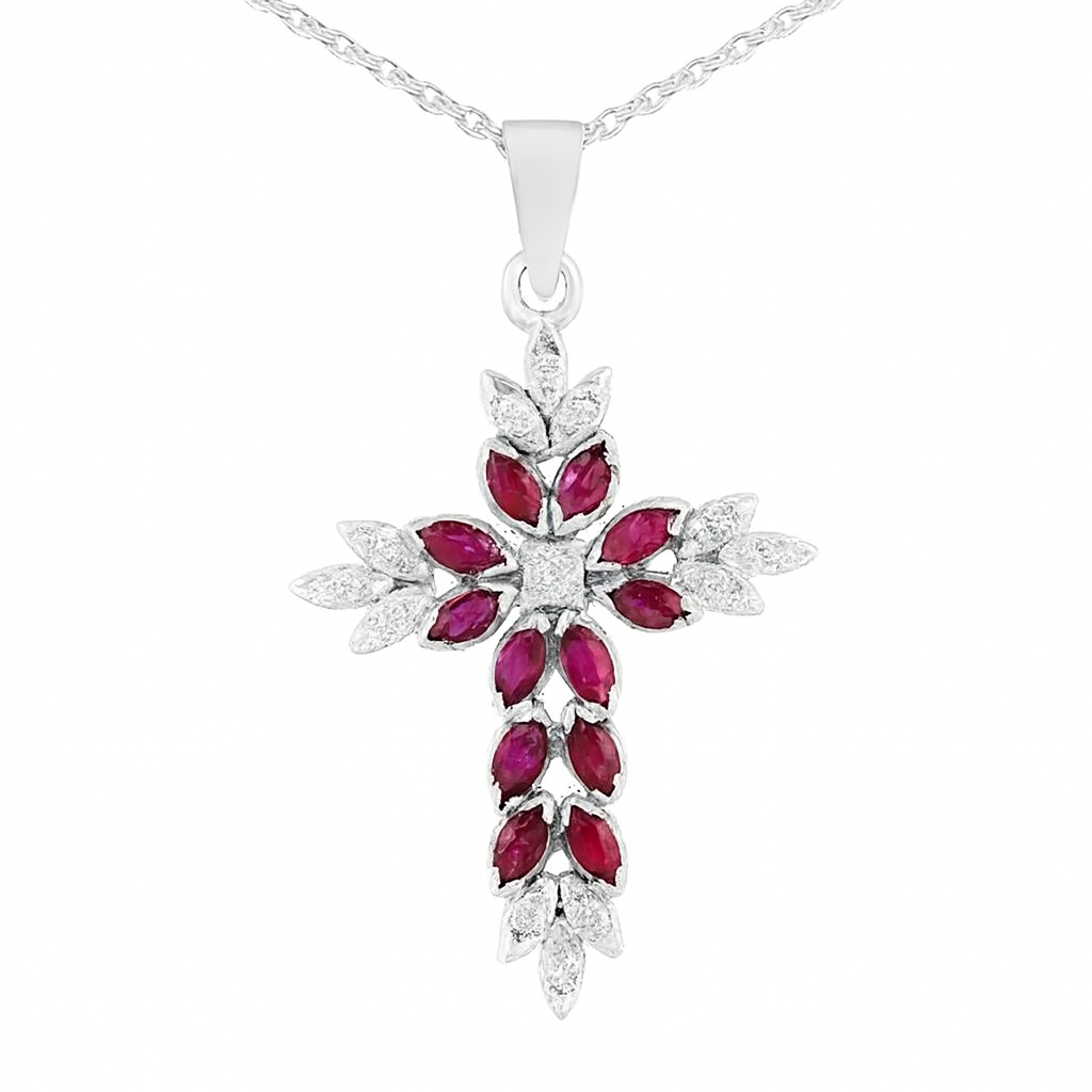 Natural Ruby And Diamond Cross Pendant Necklace In 18k White Gold