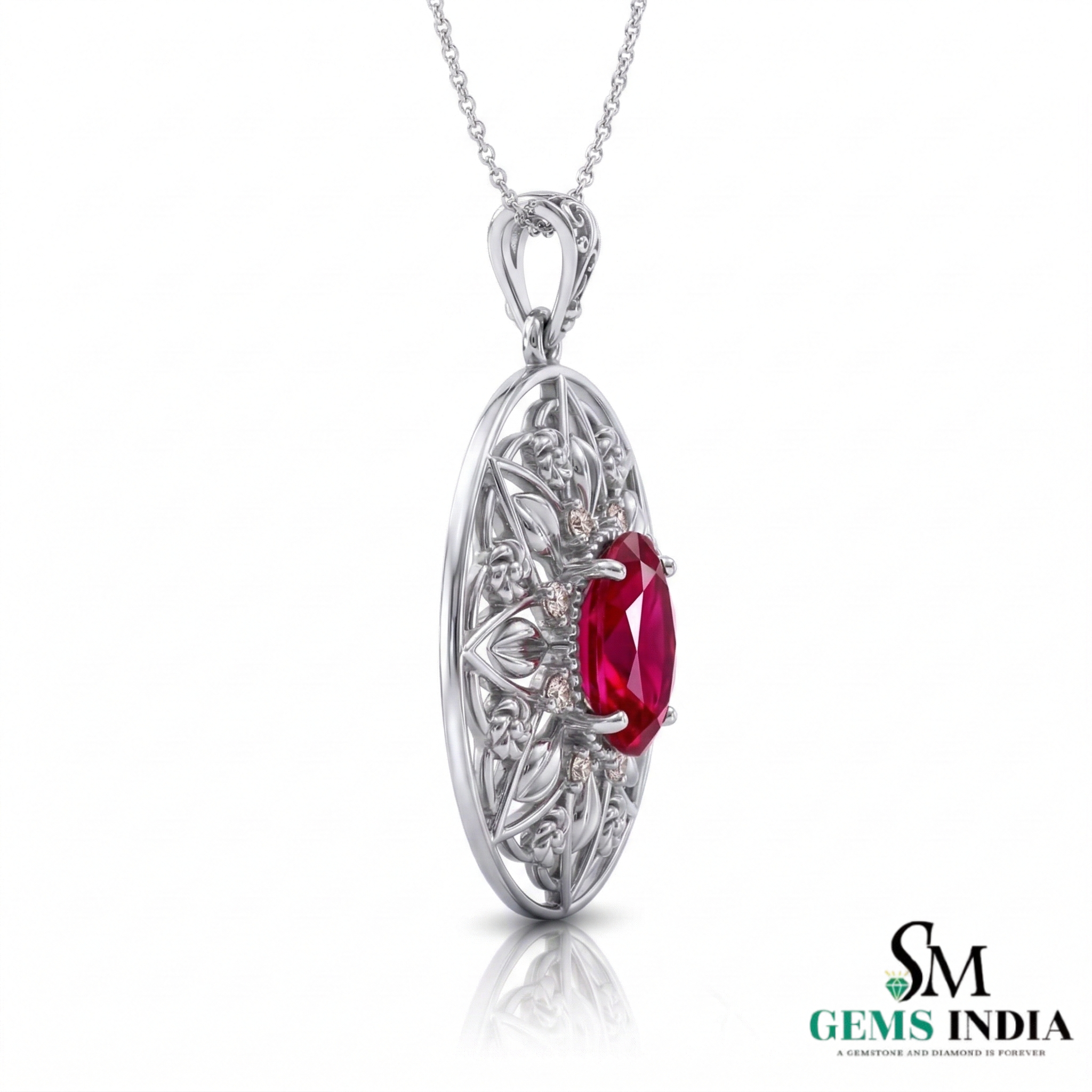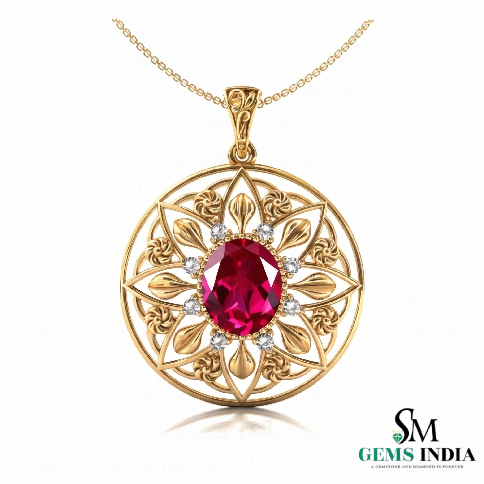 Oval Red Ruby Statement Pendant Intricate Floral Gold Jewelry