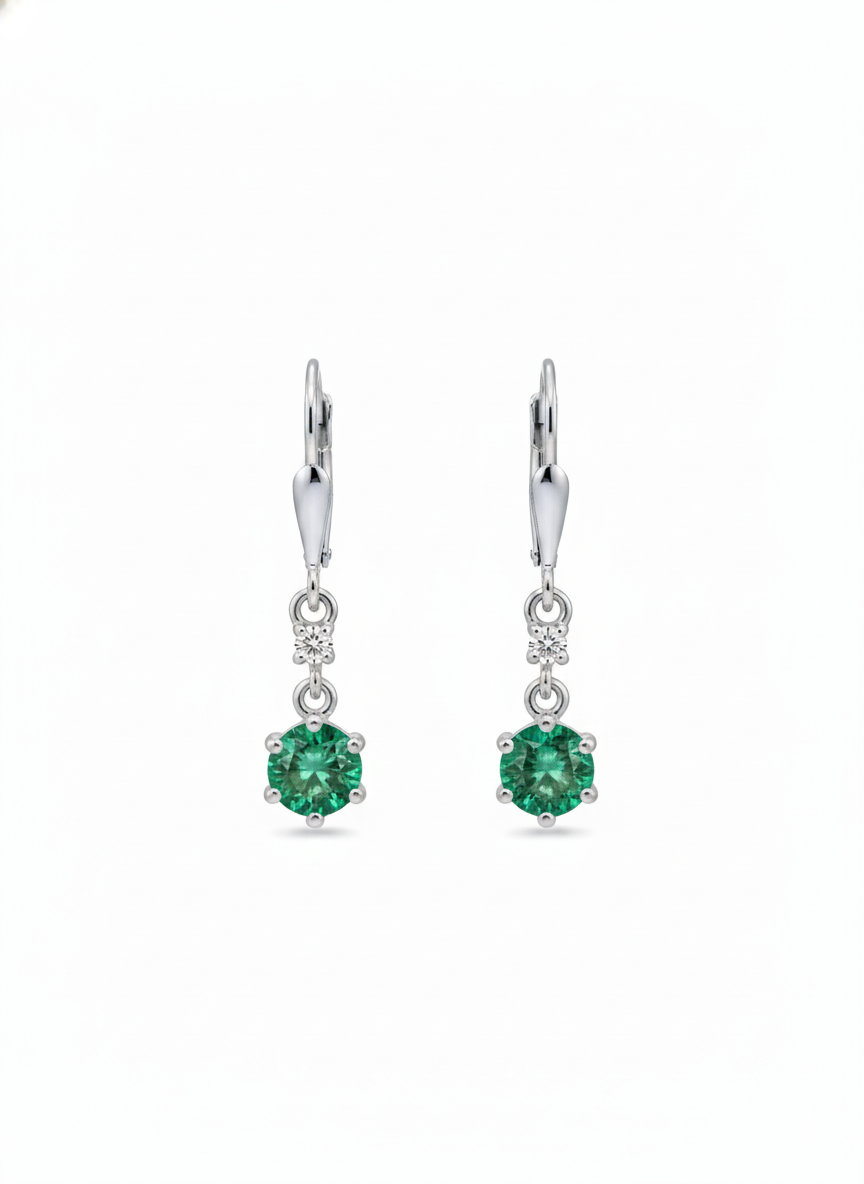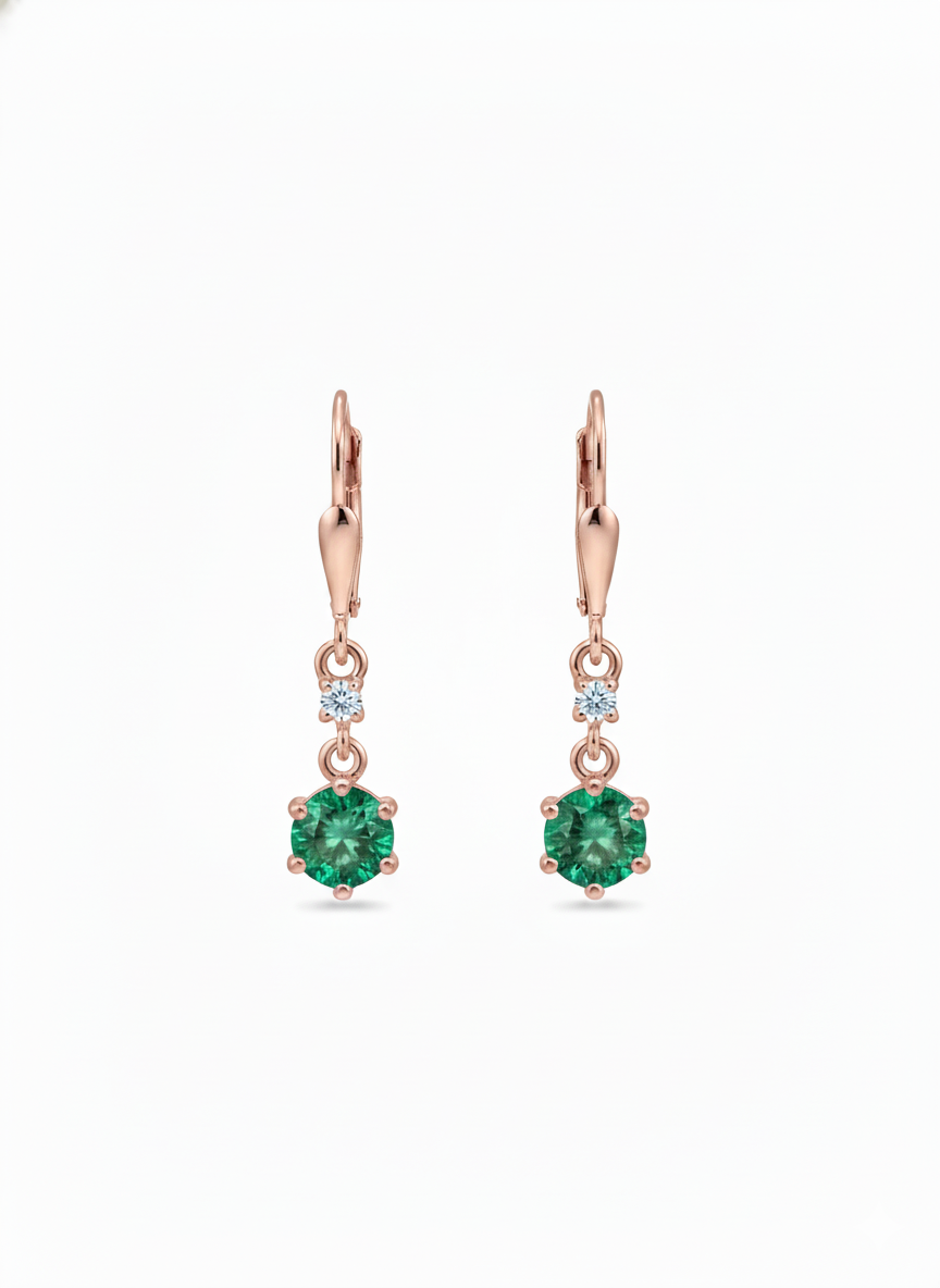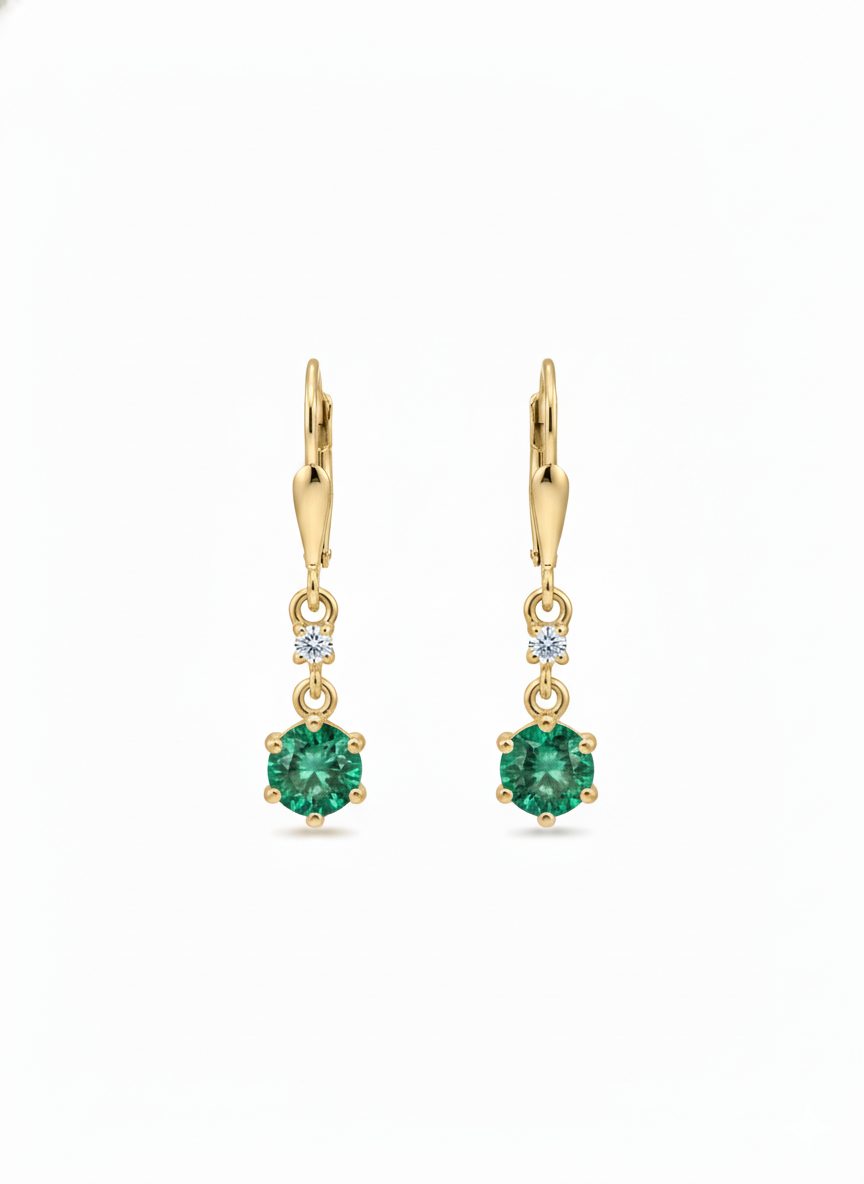 Round Natural Emerald & Diamond Drop Earrings in 14K Gold Dainty Lever back Design